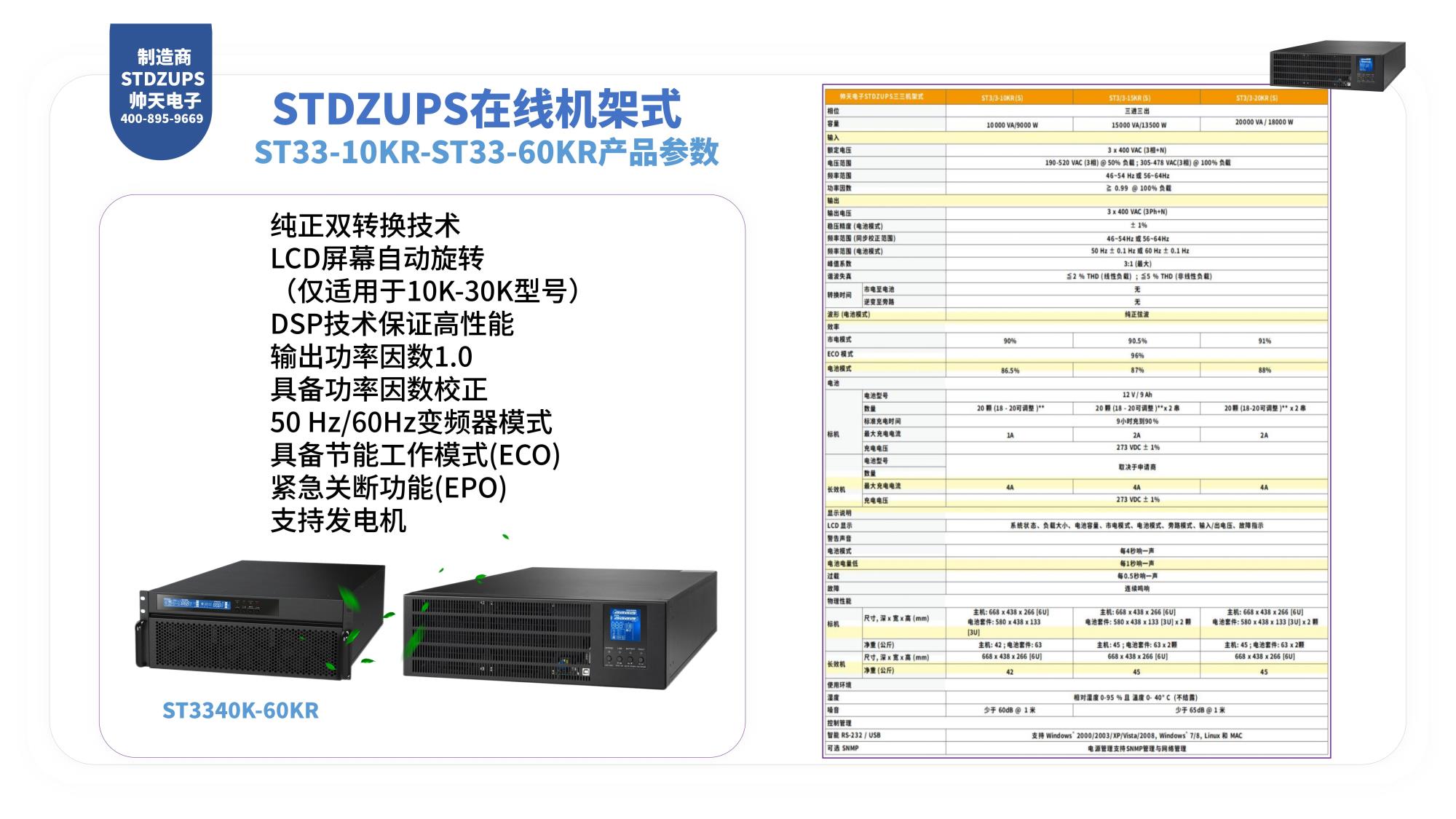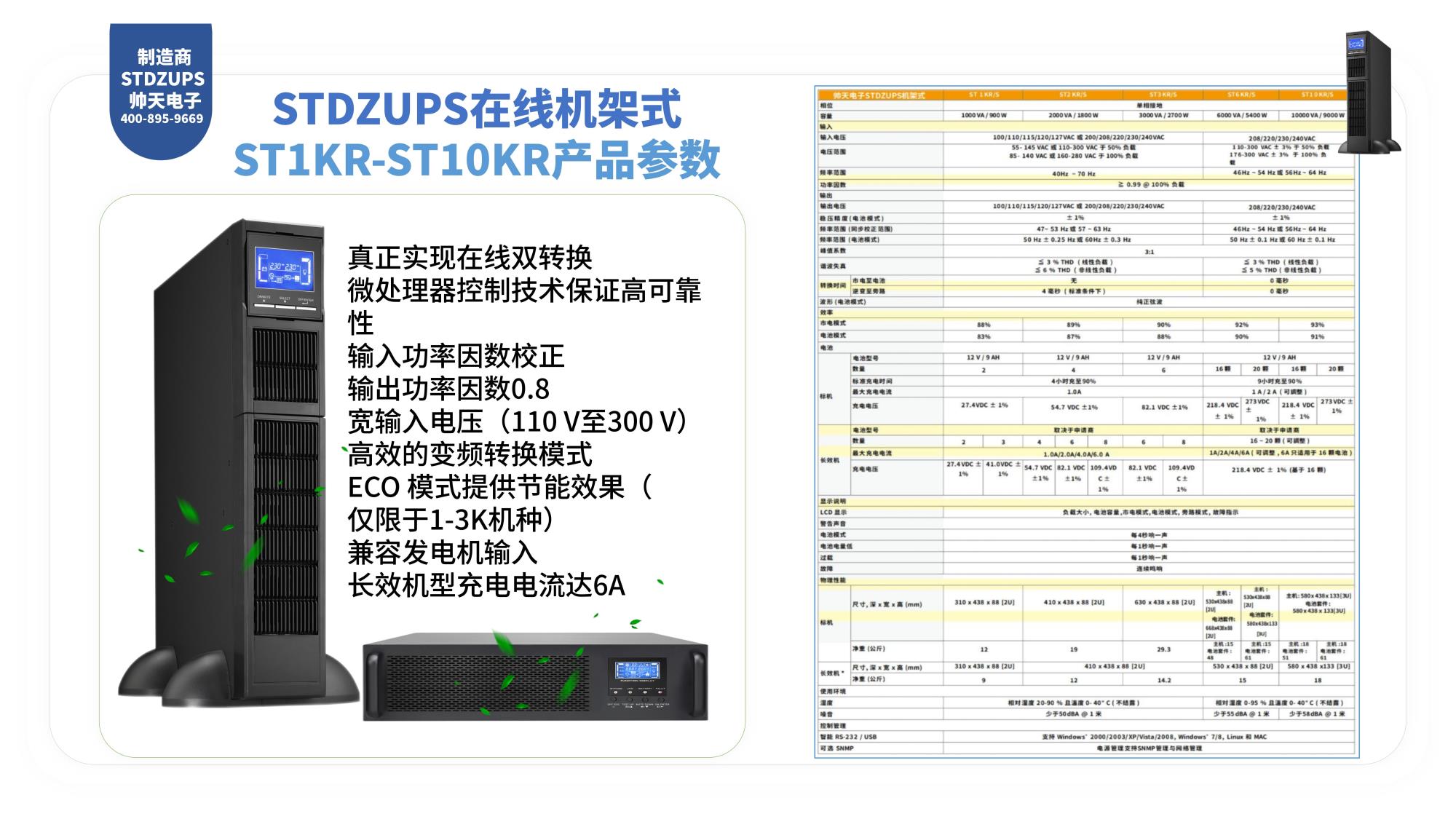 真正实现在线双转换 微处理器控制技术保证高可靠性 输入功率因数校正 输出功率因数0.8 宽输入电压(110 V至300 V) 高效的变频转换模式 ECO 模式提供节能效果(仅限于1-3K机种 兼容发电机输入 长效机型充电电流达6A